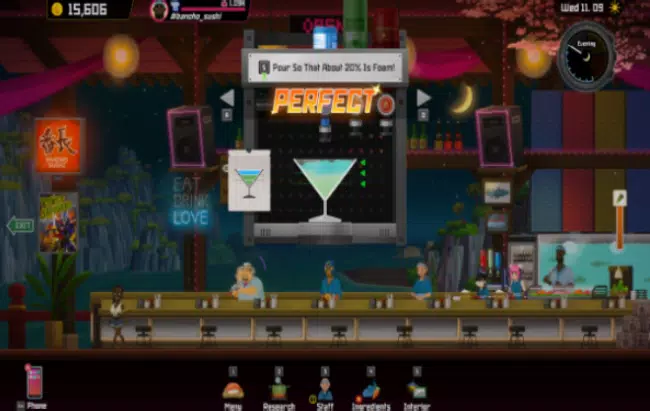 When night falls, Dave stops diving and starts cooking sushi. The game changes, and now you run a sushi restaurant. You turn the sea treasures you found into ingredients for sushi rolls. You manage the restaurant, serve sushi to customers, keep track of money, and ensure diners are happy.