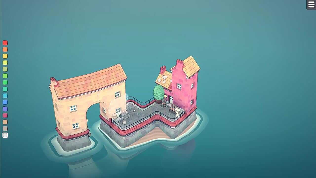 Townscaper Apk is developed by Oskar Stålberg with the aim to create beautiful structures that help the mind to relax. You can choose the colours you want and click on the water. Bridges and buildings will start forming. There are two things you can do except choosing the colour, and this is either to create or destroy the structure.