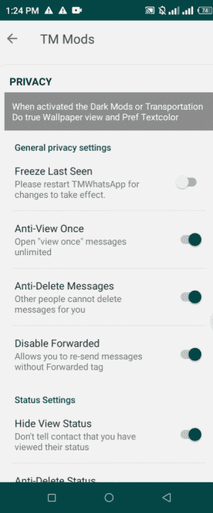 Privacy settings of TM Whatsapp have all kinds of options, from hiding your message seen to hiding status seen. Overall, TM Whatsapp stands out as one of the best Whatsapp mod apk.