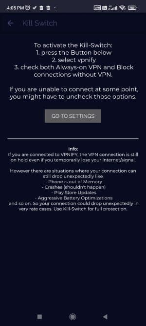 Kill switch protection : Many apps are highly insecure and harmful because they breach your data and information, which leads to data leaks or device hacks. Vpnify Kill switch mode helps you recognize those apps and protect your data and device with kill switch protection.