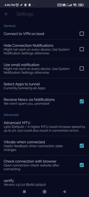 There are more than 30 countries and 200 IP addresses to connect to your server. Your mobile device will automatically connect to that autoselected country’s server and IP by tapping on connect. You can tunnel all apps that you want to use Vpnify from settings.